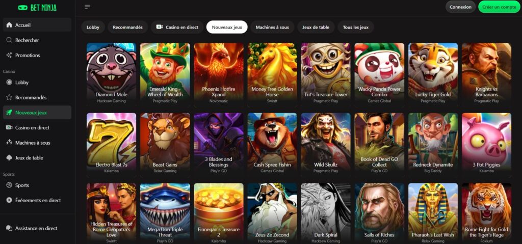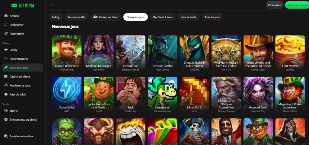Le cœur de Betninja bat au rythme de plus de deux mille jeux de casino, couvrant tous les genres pour satisfaire chaque envie. Les catégories vont des machines à sous modernes aux classiques du casino traditionnel, en passant par les tables animées par de véritables croupiers en direct. Un moteur de recherche performant et divers filtres permettent de naviguer facilement parmi les titres ou de cibler un éditeur spécifique, renforçant ainsi la fidélité des joueurs.