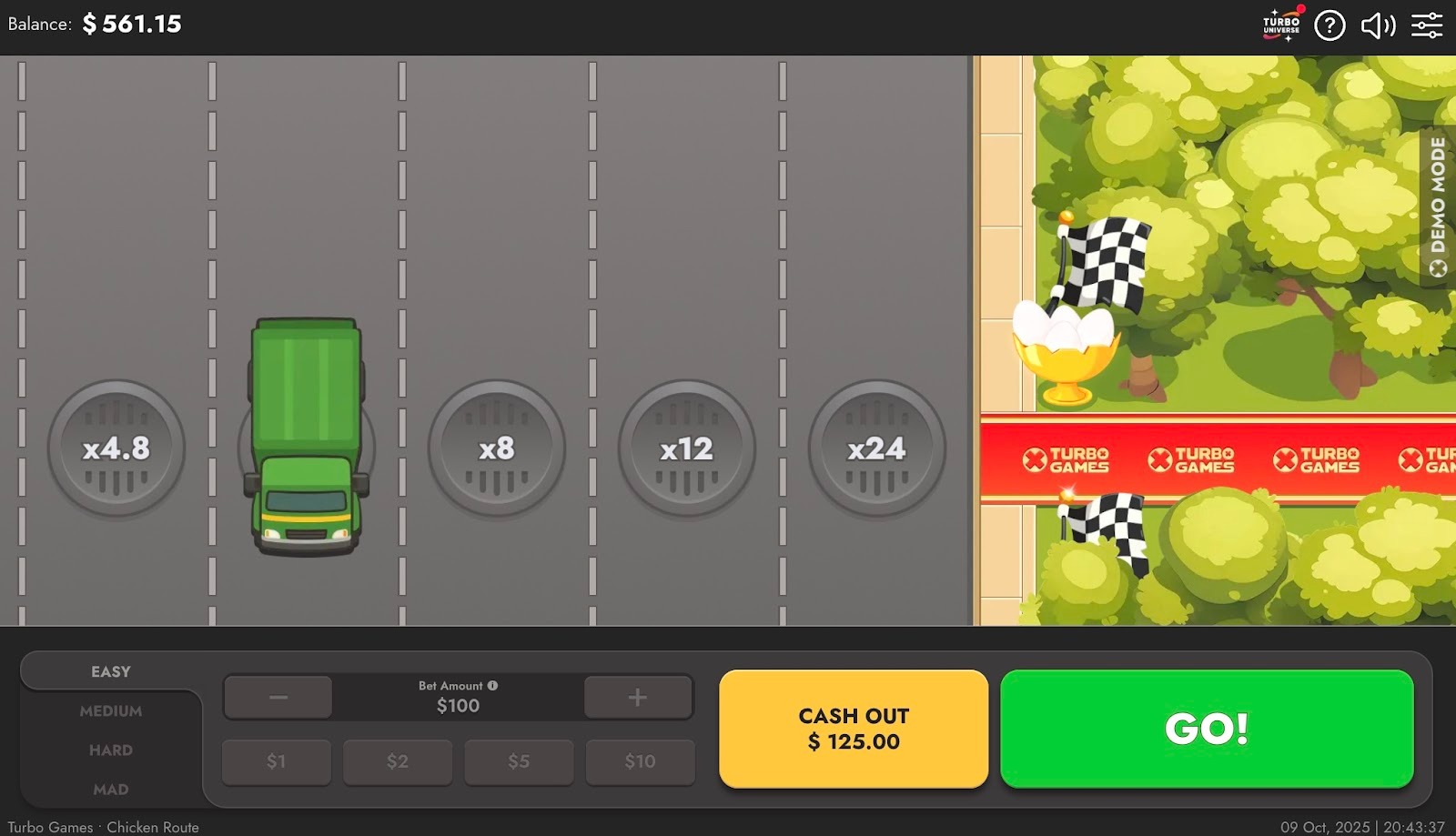 Chicken Route est un mini-jeu casino développé par Turbo Games, dans lequel vous accompagnez une poule déterminée à traverser une route. Le principe est simple : à chaque pas réussi, le multiplicateur de votre mise augmente. Mais attention, les véhicules circulent à toute vitesse, et un seul faux pas peut tout faire basculer.