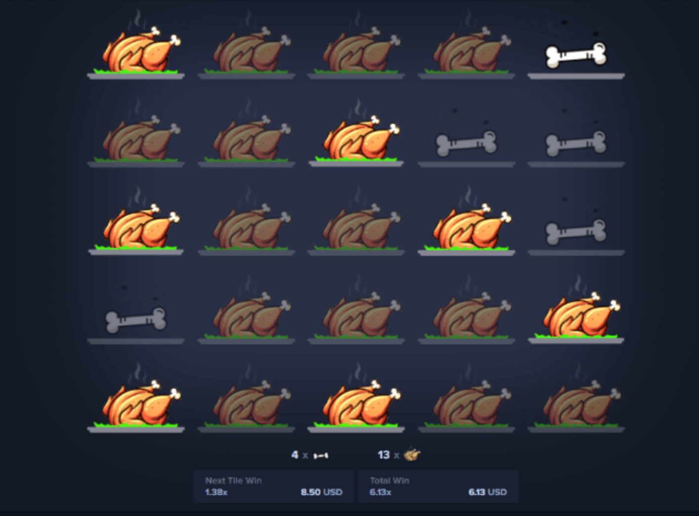 À chaque case révélée contenant un poulet, un multiplicateur s’applique aux gains potentiels. Plus vous enchaînez de découvertes positives, plus votre cagnotte augmente, mais risquer une nouvelle fois peut la remettre entièrement en cause.