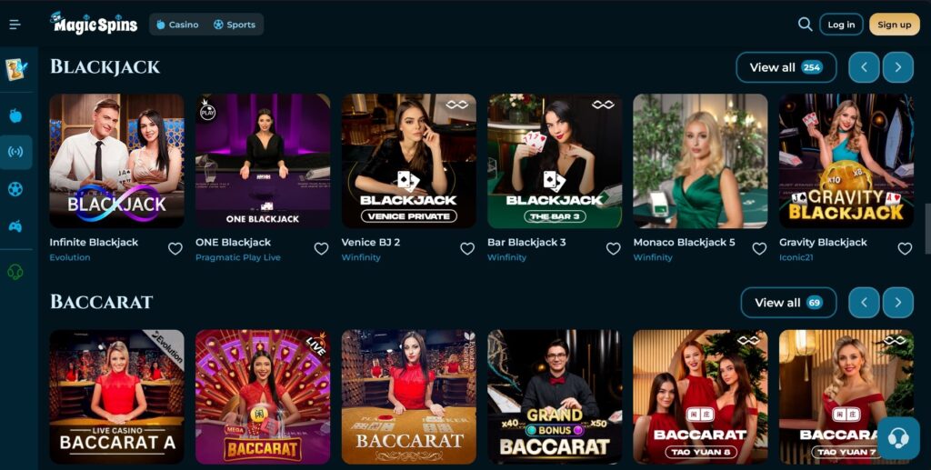 L’expérience proposée par Magic Spins Casino ne s’arrête pas aux traditionnelles machines à sous. Les amateurs de blackjack, poker ou baccarat peuvent y retrouver leurs jeux favoris, enrichis par plusieurs variantes modernes. Une salle virtuelle regroupe ainsi plus de 1000 titres, oscillant entre divertissement pur et stratégie réfléchie. Cette variété permet vraiment de changer régulièrement d’ambiance et de mécaniques de jeu.