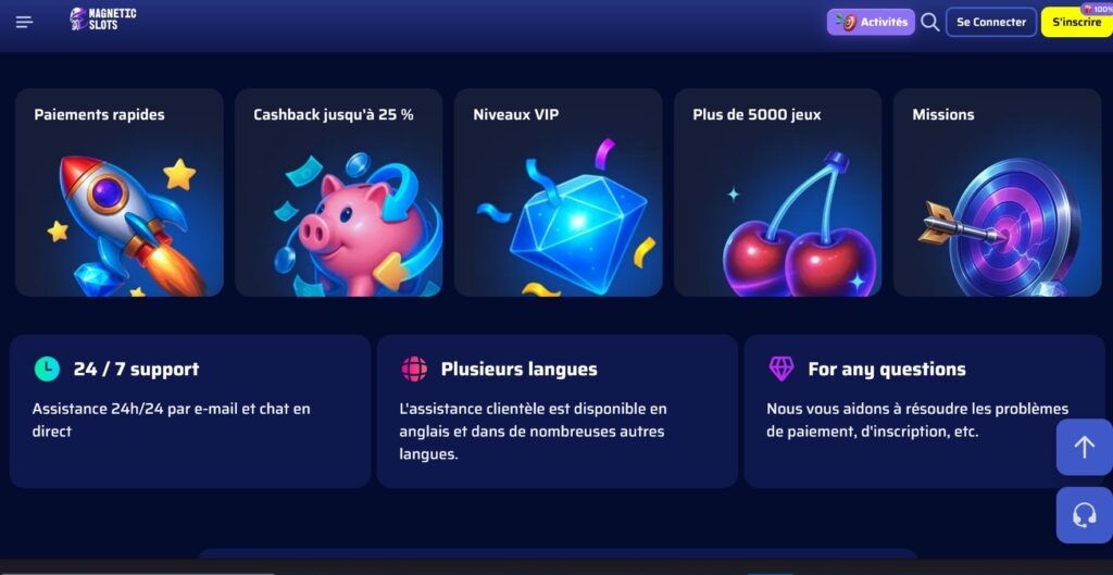 Au-delà des bonus de bienvenue, Magnetic slots propose un éventail d’incitations conçues pour récompenser la régularité. Chaque semaine, un cashback automatique permet de récupérer une part de ses mises non gagnantes, sans démarche fastidieuse. Le système fonctionne automatiquement et crédite votre compte, aucune action manuelle n’est requise.