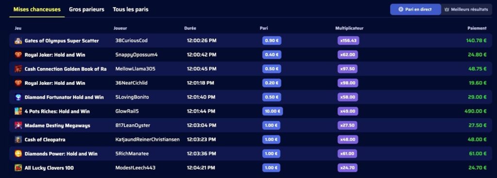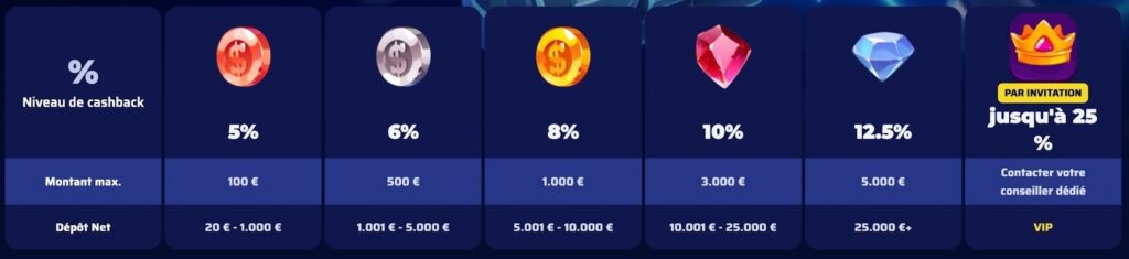 Le cashback hebdomadaire jusqu’à 25 % est aussi un vrai filet de sécurité qui nous a servi, où nous avons pu récupérer plusieurs centaines d’euros en 4 semaines. En effet, cette formule permet de limiter les pertes sur une semaine malchanceuse et encourage les joueurs à revenir régulièrement.