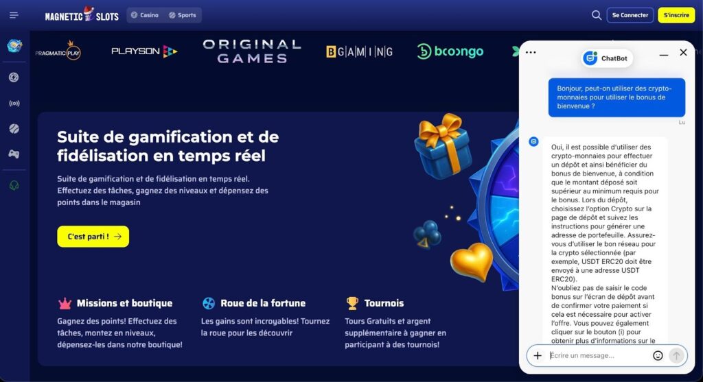 Le service client de Magnetic Slots fonctionne 24h/24 et 7j/7, ce qui garantit une assistance permanente aux joueurs. Avant de nous inscrire dans le cadre de ce test, nous avons d’ailleurs tenu à le vérifier en posant directement des questions, notamment sur les dépôts à travers des cryptomonnaies.
