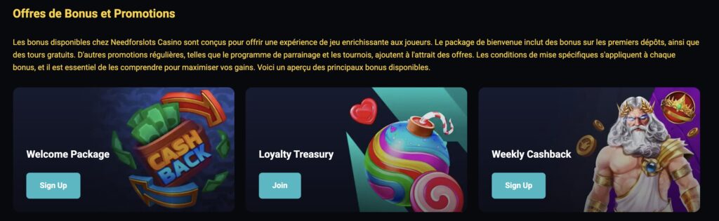 Loin de se limiter à l’accueil, Needforslots maintient la motivation grâce à de nombreuses récompenses régulières : cashbacks chaque semaine, rakeback pour fidéliser, bonus de recharge spécifiques et tournois quotidiens où chacun peut tenter sa chance pour décrocher des gains supplémentaires.